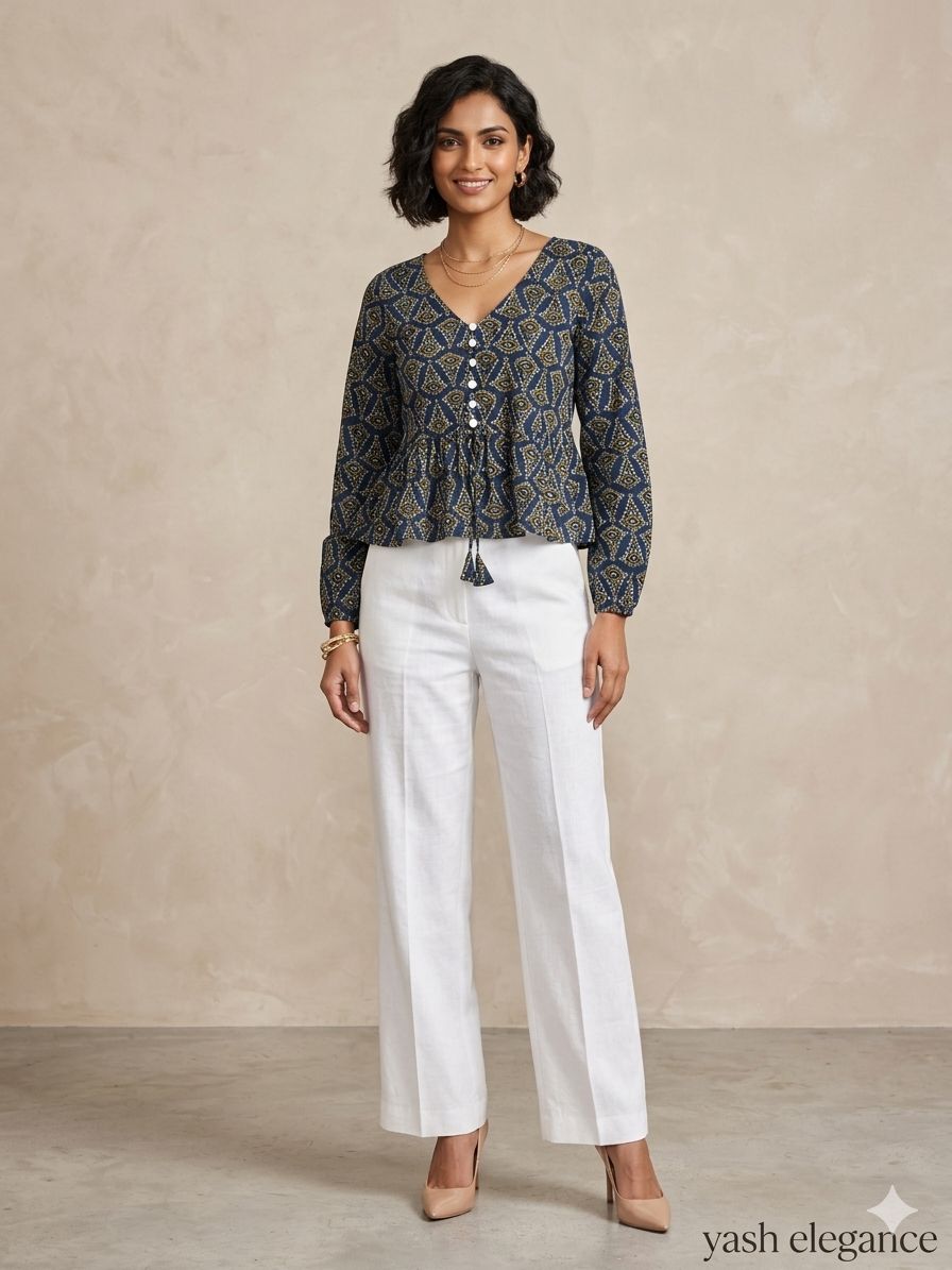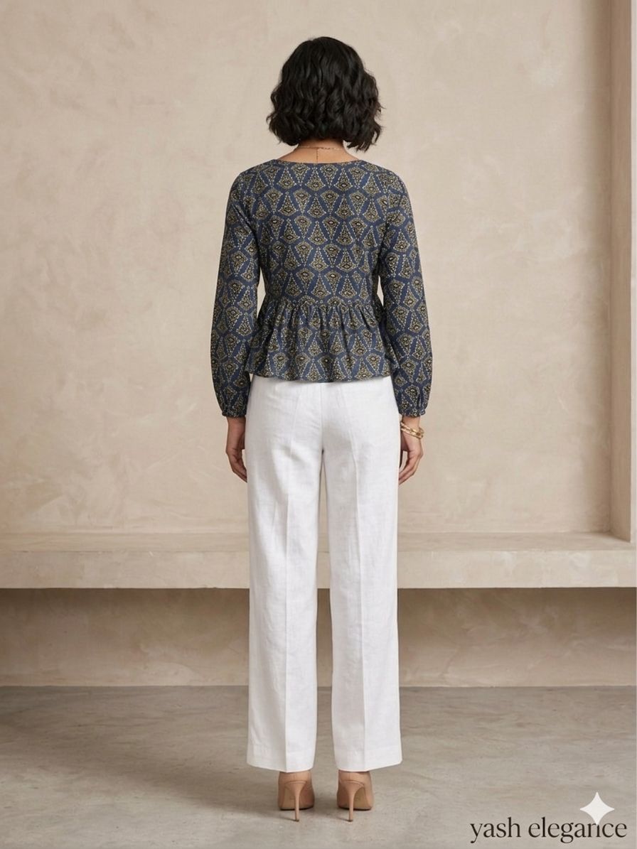 Crafted in a rich indigo base, the top features intricate mustard and white ethnic motifs inspired by classic hand block artistry, giving it a unique and artisanal appeal. Pair it with jeans, skirts, or ethnic bottoms to create effortlessly chic looks that blend modern style with traditional elegance.